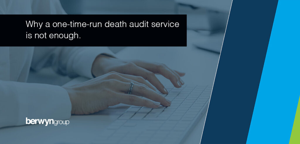 We often hear from organizations that run an annual or semi-annual death audit and think they are doing enough. However, they are likely choosing a path that ends up costing them more in overpayments and time. It’s important to have continuous monitoring of your population and take a proactive approach. Here’s why: Deaths occur constantly […]